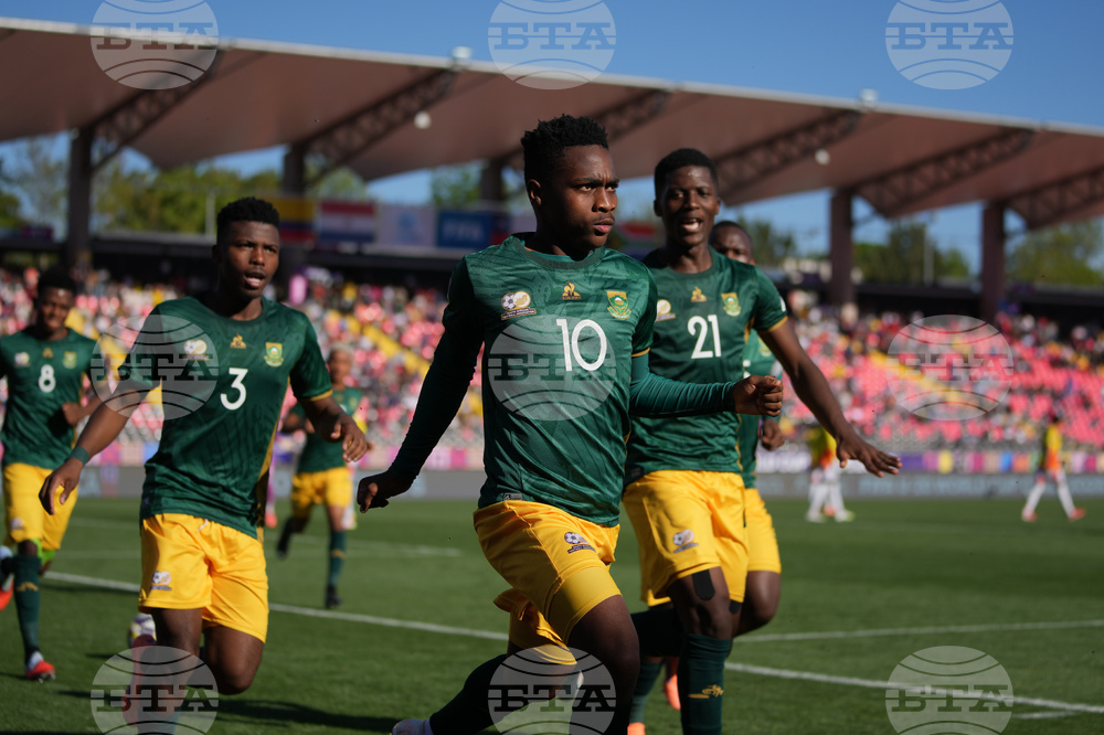 Players of South Africa leave the field after losing to Colombia 3-1 at the end of a FIFA U-20 World Cup round of sixteen soccer match at Fiscal Stadium in Talca, Chile, Wednesday, Oct. 8, 2025. (AP Photo/Andre Penner)