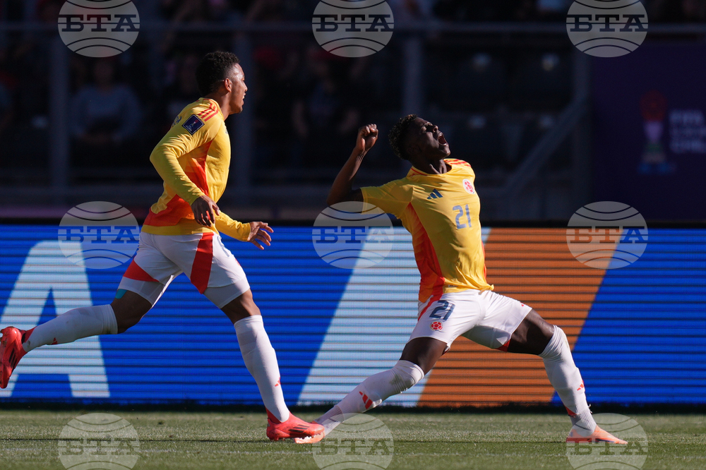 Colombia's Neyser Villareal celebrates scoring his side's second goal against South Africa during a FIFA U-20 World Cup round of sixteen soccer match at Fiscal Stadium in Talca, Chile, Wednesday, Oct. 8, 2025. (AP Photo/Andre Penner)