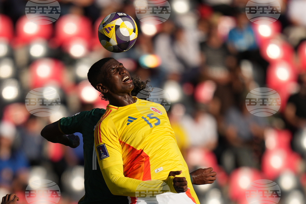 Colombia's Yeimar Mosquera, front, and South Africa's Tylon Smith go for a header during a FIFA U-20 World Cup round of sixteen soccer match at Fiscal Stadium in Talca, Chile, Wednesday, Oct. 8, 2025. (AP Photo/Andre Penner)