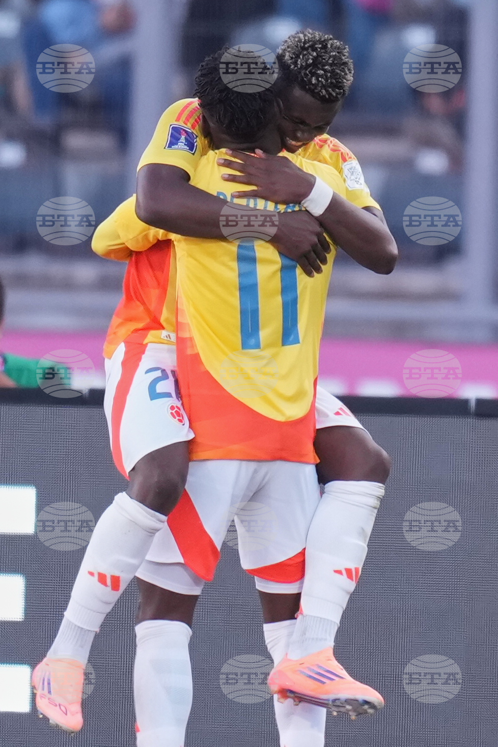 Colombia's Joel Canchimbo, left, celebrates scoring his side's opening goal against South Africa during a FIFA U-20 World Cup round of sixteen soccer match at Fiscal Stadium in Talca, Chile, Wednesday, Oct. 8, 2025. (AP Photo/Andre Penner)