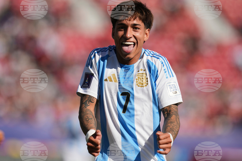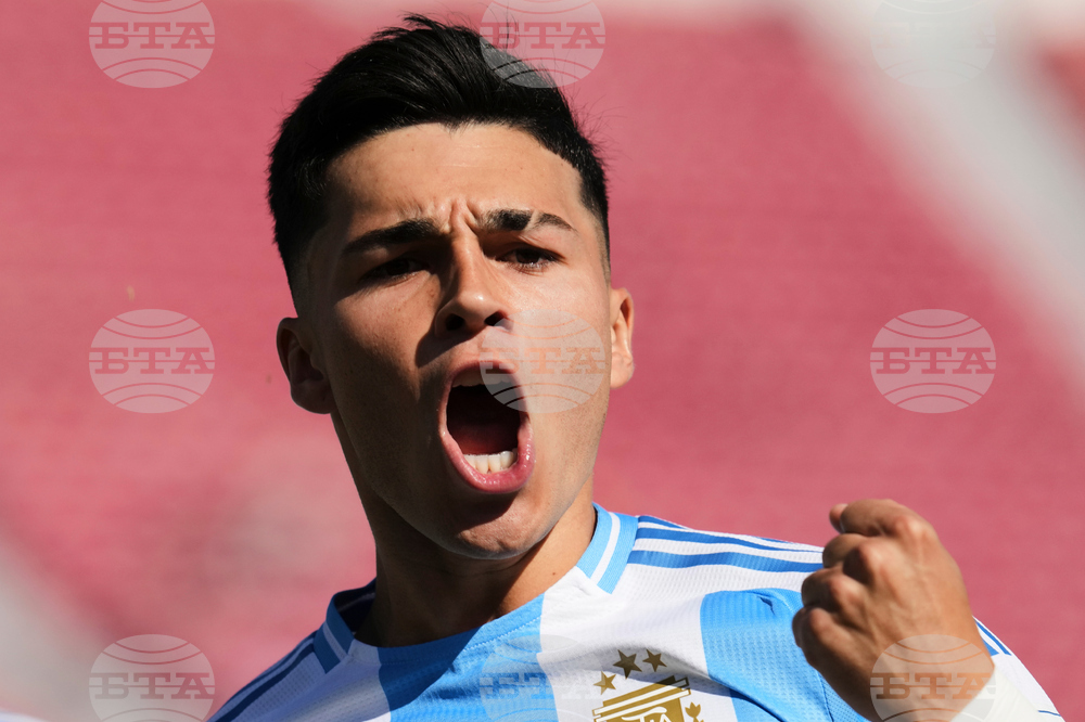 Argentina's Mateo Silvetti celebrates scoring his side's fourth goal against Nigeria during a FIFA U-20 World Cup round of sixteen soccer match at National Stadium in Santiago, Chile, Wednesday, Oct. 8, 2025. (AP Photo/Matias Delacroix)