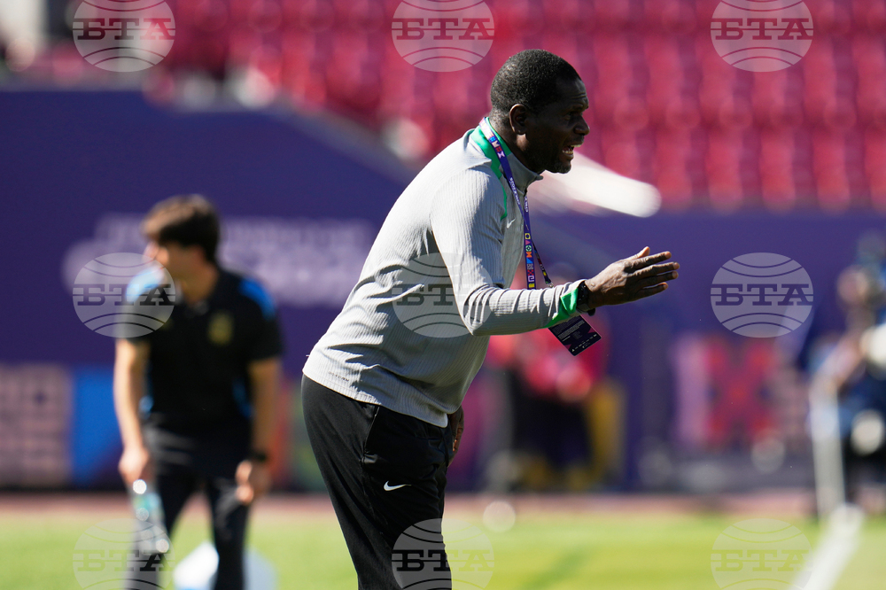 Nigeria's coach Aliyu Zubair reacts during a FIFA U-20 World Cup round of sixteen soccer match against Argentina at National Stadium in Santiago, Chile, Wednesday, Oct. 8, 2025. (AP Photo/Matias Delacroix)