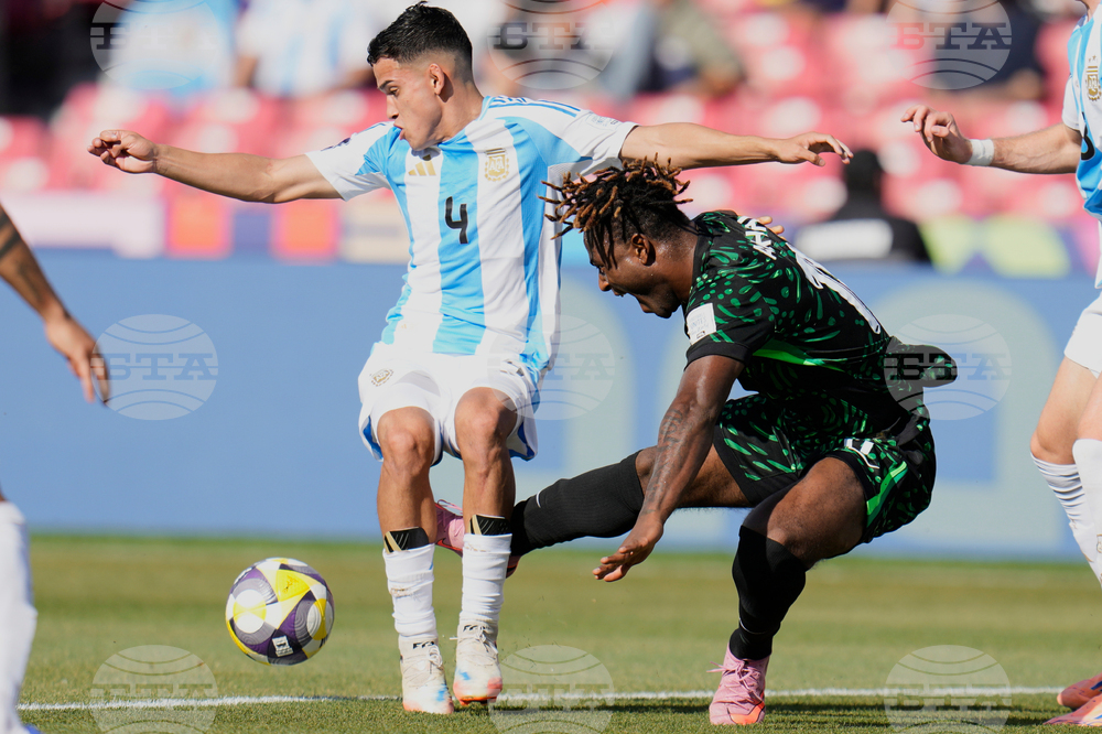 Nigeria's Daniel Daga, right, and Argentina's Maher Carrizo battle for the ball during a FIFA U-20 World Cup round of sixteen soccer match at National Stadium in Santiago, Chile, Wednesday, Oct. 8, 2025. (AP Photo/Esteban Felix)