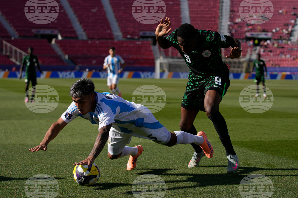 Nigeria's Tahir Maigana, below, and Argentina's Maher Carrizo battle for the ball during a FIFA U-20 World Cup round of sixteen soccer match at National Stadium in Santiago, Chile, Wednesday, Oct. 8, 2025. (AP Photo/Esteban Felix)
