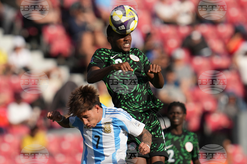 Argentina's Tobias Andrada, left, and Nigeria's Isreal Ayuma go for a header during a FIFA U-20 World Cup round of sixteen soccer match at National Stadium in Santiago, Chile, Wednesday, Oct. 8, 2025. (AP Photo/Esteban Felix)