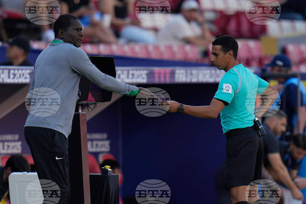 Nigeria's coach Aliyu Zubair, right, hands a purple card to assistant referee Jalal Jayed to request a review during a FIFA U-20 World Cup round of sixteen soccer match against Argentina at National Stadium in Santiago, Chile, Wednesday, Oct. 8, 2025. (AP Photo/Esteban Felix)