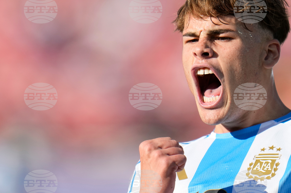 Argentina's Maher Carrizo celebrates scoring his side's third goal against Nigeria during a FIFA U-20 World Cup round of sixteen soccer match at National Stadium in Santiago, Chile, Wednesday, Oct. 8, 2025.(AP Photo/Matias Delacroix)