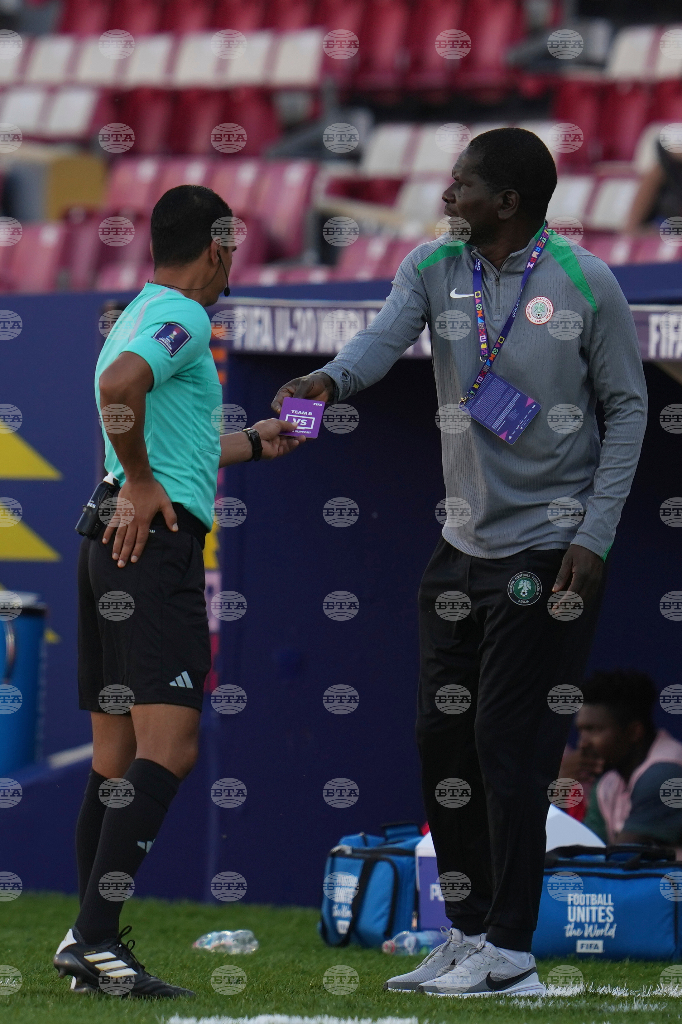 Nigeria's coach Aliyu Zubair hands a card to assistant referee Jalal Jayed requesting a review during a FIFA U-20 World Cup round of sixteen soccer match against Argentina at National Stadium in Santiago, Chile, Wednesday, Oct. 8, 2025. (AP Photo/Matias Delacroix)