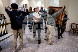 A court officer clears the area outside of a courtroom, Wednesday, Oct. 8, 2025, at Boston Municipal Court, where arraignments were held for protesters arrest at a pro-Palestinian rally in Boston on Tuesday night. (Mark Stockwell/The Boston Herald via AP, Pool)