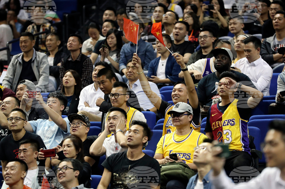 FILE - A fan holds Chinese national flags as he cheers with other fans during a preseason NBA basketball game between the Brooklyn Nets and Los Angeles Lakers at the Mercedes Benz Arena in Shanghai, China, Oct. 10, 2019. (AP Photo/File)