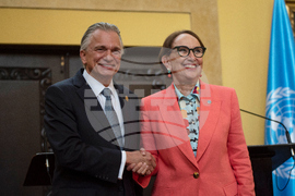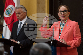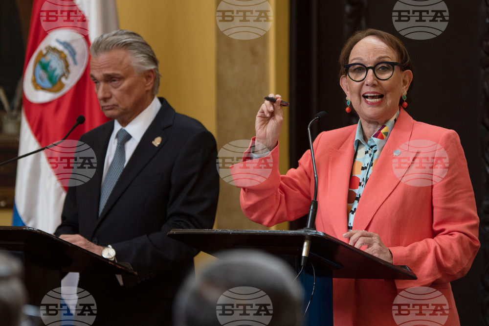 Foreign Minister Arnoldo André Tinoco, left, and former Vice President Rebeca Grynspan shake hands in San Jose, Costa Rica, Wednesday, Oct. 8, 2025. (AP Photo/Jose Diaz)