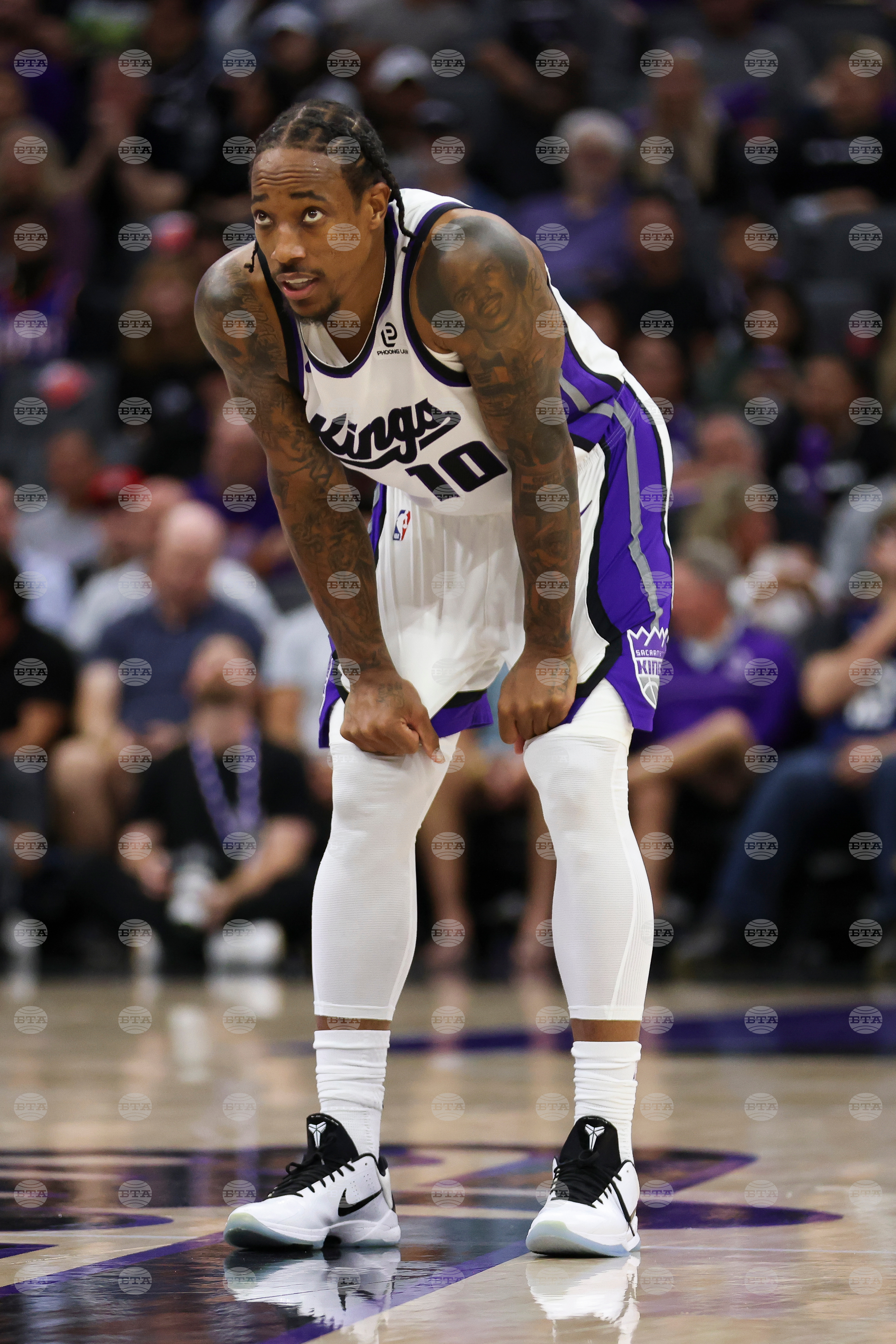 Sacramento Kings forward DeMar DeRozan looks on during warms up of an NBA basketball preseason game against the Toronto Raptors, Wednesday, Oct. 8, 2025, in Sacramento, Calif. (AP Photo/Scott Marshall)