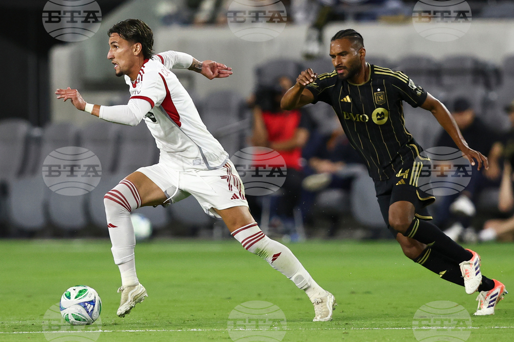 Los Angeles FC defender Artem Smolyakov, center, cross the ball against Toronto FC midfielder Maxime Dominguez, left, as goalkeeper Sean Johnson (1) watches during the first half of an MLS soccer match, Wednesday, Oct. 8, 2025, in Los Angeles. (AP Photo/Jessie Alcheh)