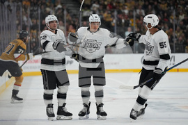 Los Angeles Kings celebrate after Los Angeles Kings right wing Joel Armia (40) scored against the Vegas Golden Knights during the second period of an NHL hockey game Wednesday, Oct. 8, 2025, in Las Vegas. (AP Photo/John Locher)