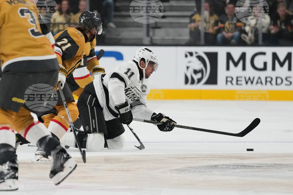 Los Angeles Kings center Anze Kopitar (11) passes against the Vegas Golden Knights during the first period of an NHL hockey game Wednesday, Oct. 8, 2025, in Las Vegas. (AP Photo/John Locher)