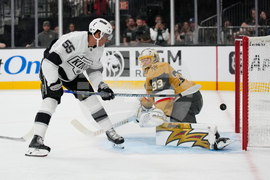 Los Angeles Kings right wing Adrian Kempe (9) shoots against Vegas Golden Knights goaltender Adin Hill (33) during the first period of an NHL hockey game Wednesday, Oct. 8, 2025, in Las Vegas. (AP Photo/John Locher)