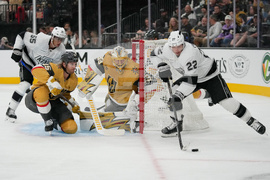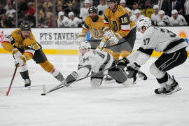 Los Angeles Kings left wing Kevin Fiala (22) looks to pass against the Vegas Golden Knights during the first period of an NHL hockey game Wednesday, Oct. 8, 2025, in Las Vegas. (AP Photo/John Locher)