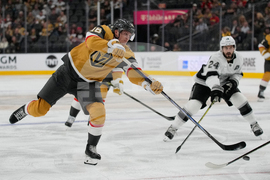 Vegas Golden Knights right wing Pavel Dorofeyev (16) shoots to score against the Los Angeles Kings during the second period of an NHL hockey game Wednesday, Oct. 8, 2025, in Las Vegas. (AP Photo/John Locher)