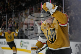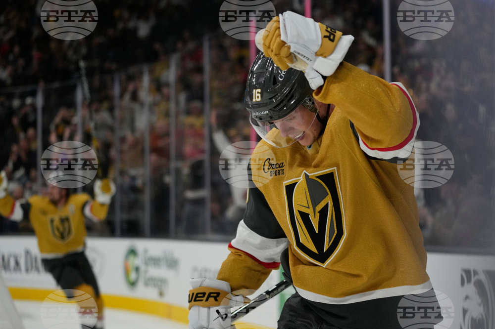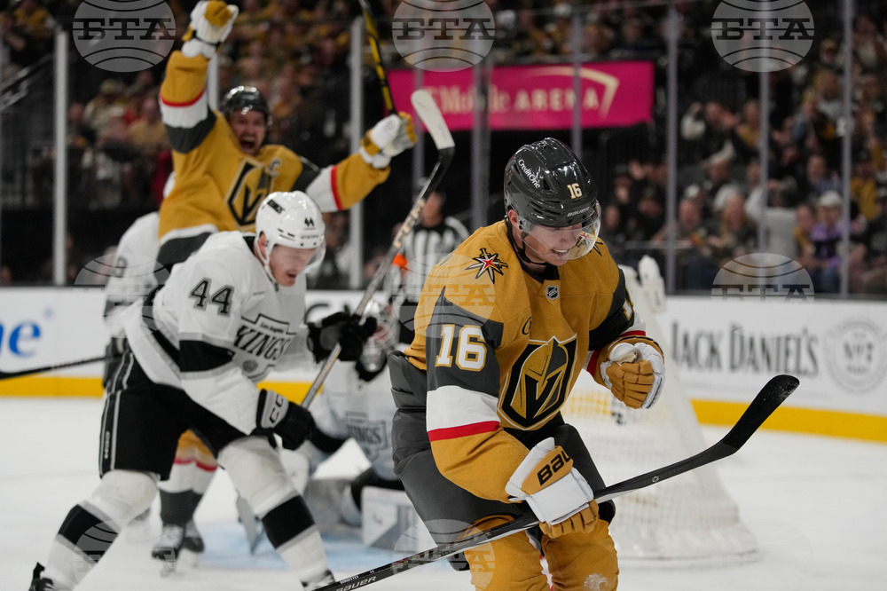 Vegas Golden Knights right wing Pavel Dorofeyev (16) celebrates after scoring against the Los Angeles Kings during the second period of an NHL hockey game Wednesday, Oct. 8, 2025, in Las Vegas. (AP Photo/John Locher)