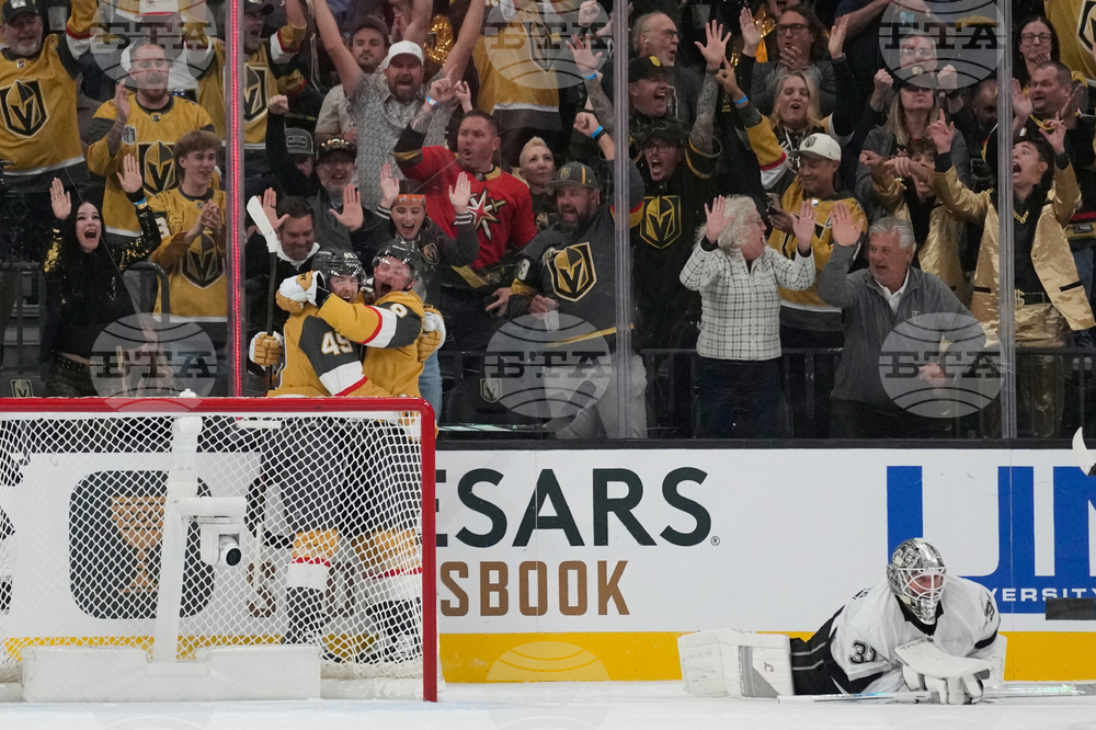 Vegas Golden Knights left wing Ivan Barbashev (49) celebrates with Vegas Golden Knights center Jack Eichel (9) after Barbashev scored against Los Angeles Kings goaltender Anton Forsberg (31) during the third period of an NHL hockey game Wednesday, Oct. 8, 2025, in Las Vegas. (AP Photo/John Locher)