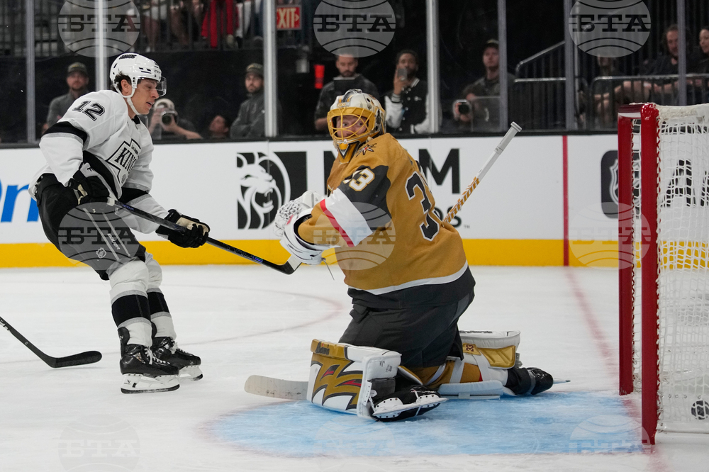 Los Angeles Kings left wing Trevor Moore (12) scores against Vegas Golden Knights goaltender Adin Hill (33) during the third period of an NHL hockey game Wednesday, Oct. 8, 2025, in Las Vegas. (AP Photo/John Locher)
