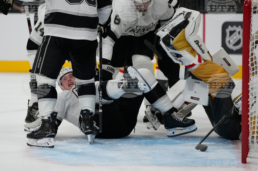 Los Angeles Kings defenseman Brandt Clarke (92) scores on Vegas Golden Knights goaltender Adin Hill (33) during the third period of an NHL hockey game Wednesday, Oct. 8, 2025, in Las Vegas. (AP Photo/John Locher)