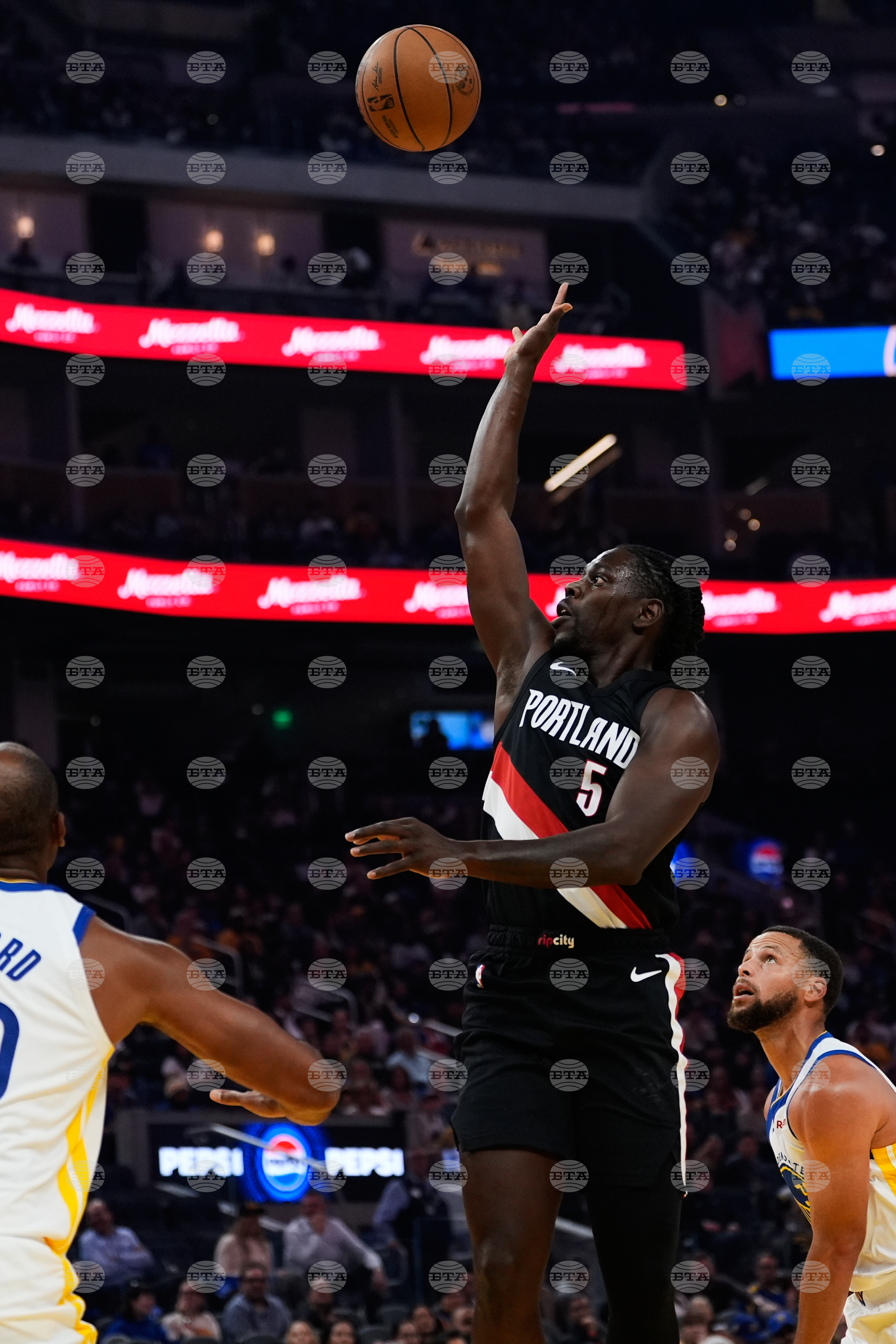 Golden State Warriors center Trayce Jackson-Davis, center, shoots while defended by Portland Trail Blazers forward Rayan Rupert, rear left, during the second half of an NBA basketball preseason game, Wednesday, Oct. 8, 2025, in San Francisco. (AP Photo/Godofredo A. Vásquez)