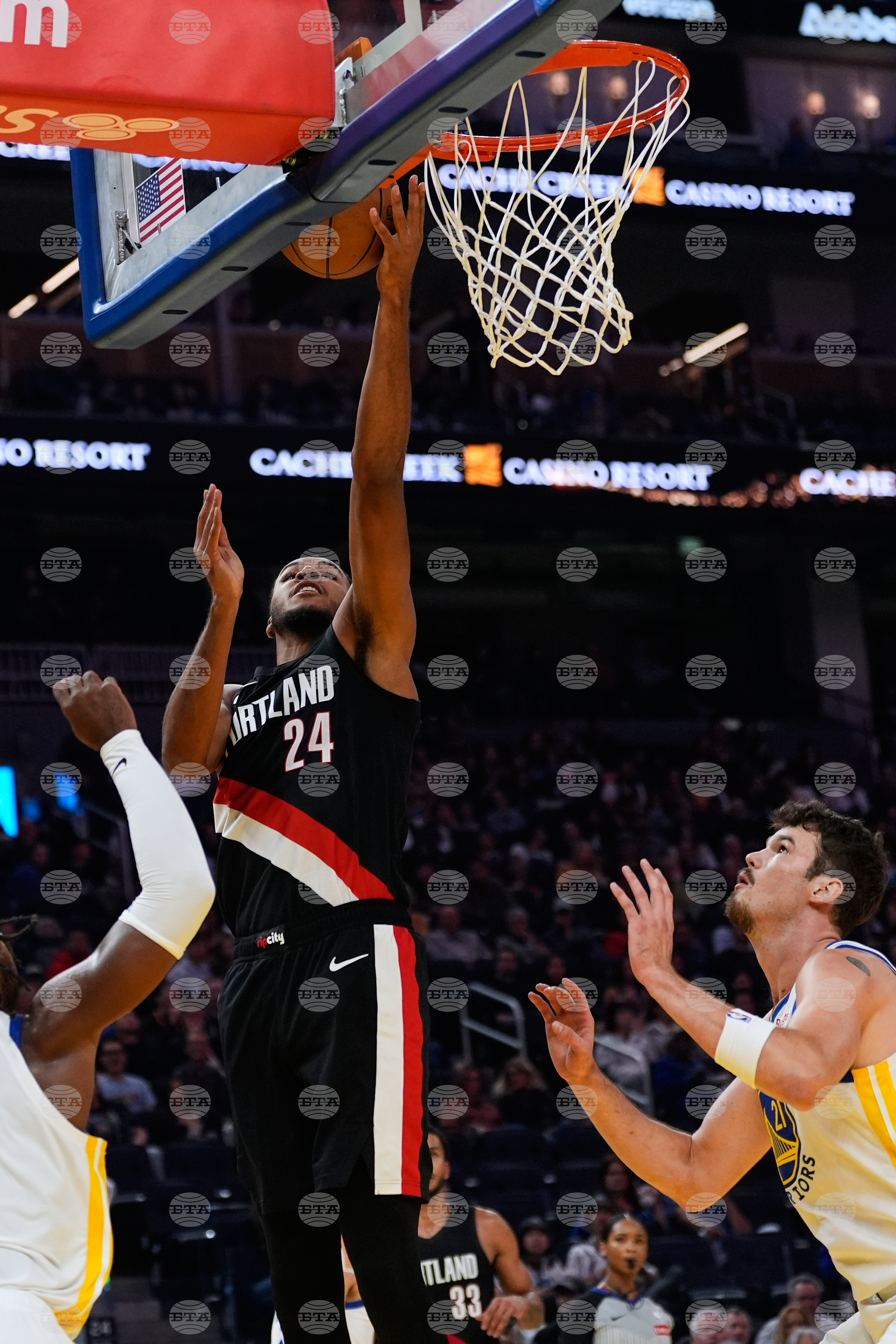 Portland Trail Blazers forward Kris Murray (24) shoots between Golden State Warriors guard Buddy Hield and center Quinten Post during the first half of an NBA basketball preseason game, Wednesday, Oct. 8, 2025, in San Francisco. (AP Photo/Godofredo A. Vásquez)