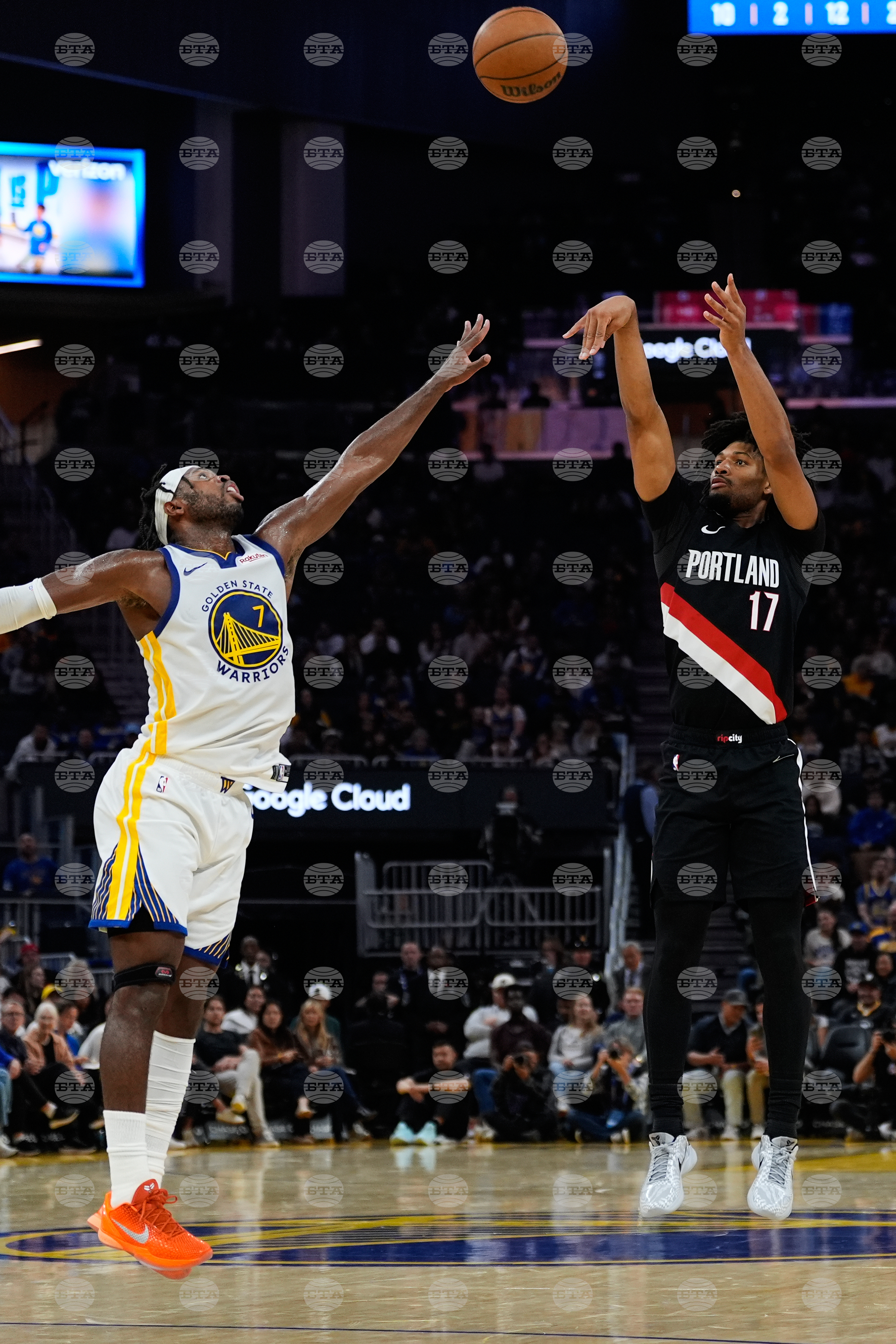 Portland Trail Blazers guard Shaedon Sharpe (17) shoots a 3-point basket during the first half of an NBA basketball preseason game against the Golden State Warriors, Wednesday, Oct. 8, 2025, in San Francisco. (AP Photo/Godofredo A. Vásquez)