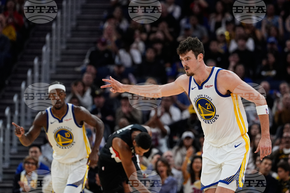 Golden State Warriors guard Moses Moody (4) passes the ball to center Trayce Jackson-Davis, foreground, while being defended by Portland Trail Blazers center Duop Reath (26) during the second half of an NBA basketball preseason game, Wednesday, Oct. 8, 2025, in San Francisco. (AP Photo/Godofredo A. Vásquez)