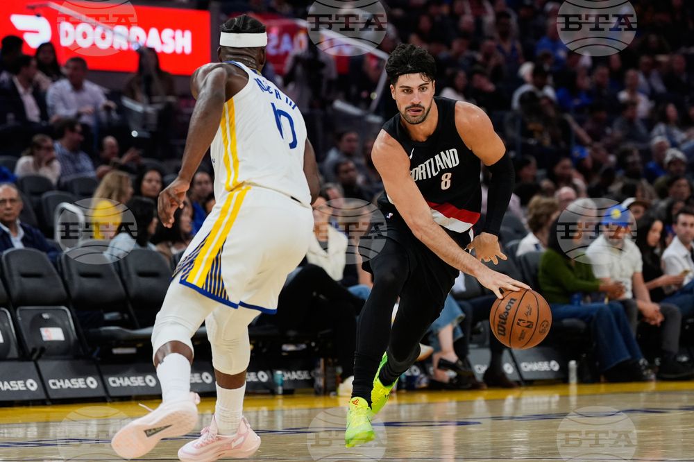 Portland Trail Blazers forward Deni Avdija (8) moves the ball while defended by Golden State Warriors forward Jimmy Butler III (10) the first half of an NBA basketball preseason game, Wednesday, Oct. 8, 2025, in San Francisco. (AP Photo/Godofredo A. Vásquez)