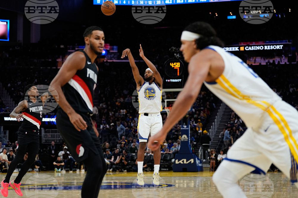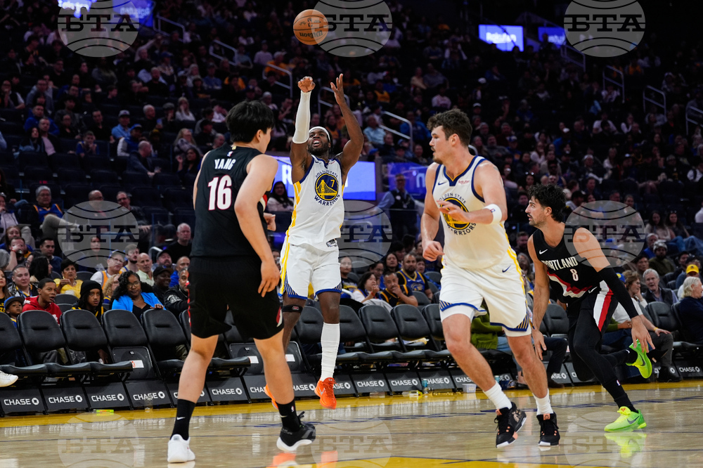 Golden State Warriors guard Moses Moody (4) shoots a 3-point basket next to Portland Trail Blazers guard Caleb Love (2) during the second half of an NBA basketball preseason game, Wednesday, Oct. 8, 2025, in San Francisco. (AP Photo/Godofredo A. Vásquez)