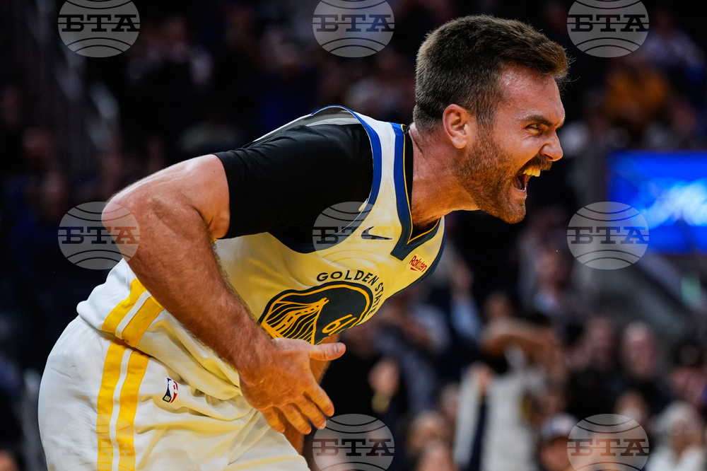 Golden State Warriors center Quinten Post (21) reacts after making a 3-point basket during the first half of an NBA basketball preseason game against the Portland Trail Blazers, Wednesday, Oct. 8, 2025, in San Francisco. (AP Photo/Godofredo A. Vásquez)