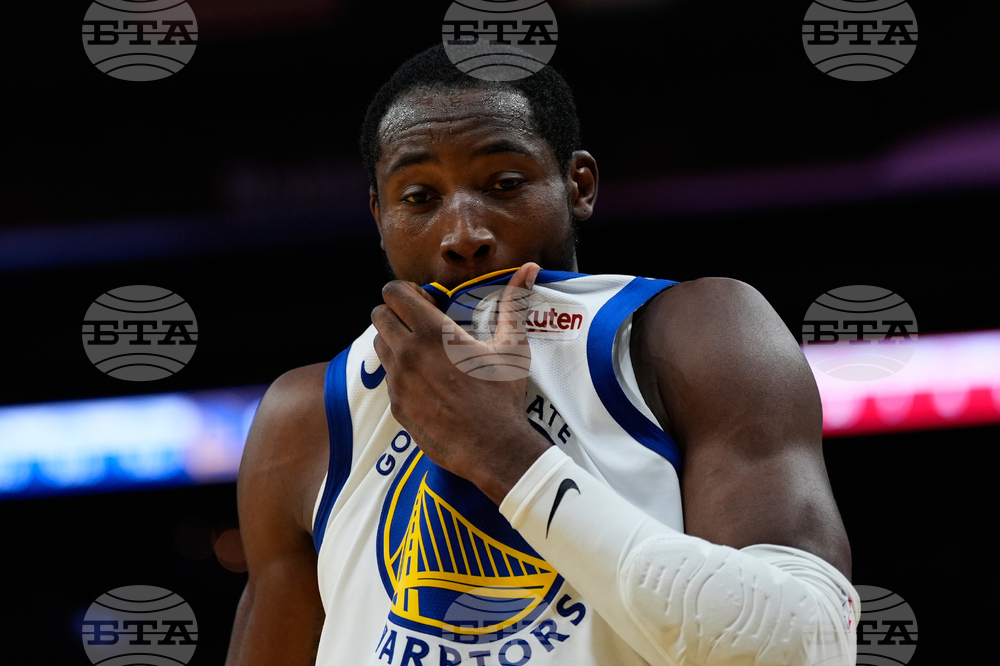 Golden State Warriors forward Jonathan Kuminga reacts during the second half of an NBA basketball preseason game against the Portland Trail Blazers, Wednesday, Oct. 8, 2025, in San Francisco. (AP Photo/Godofredo A. Vásquez)