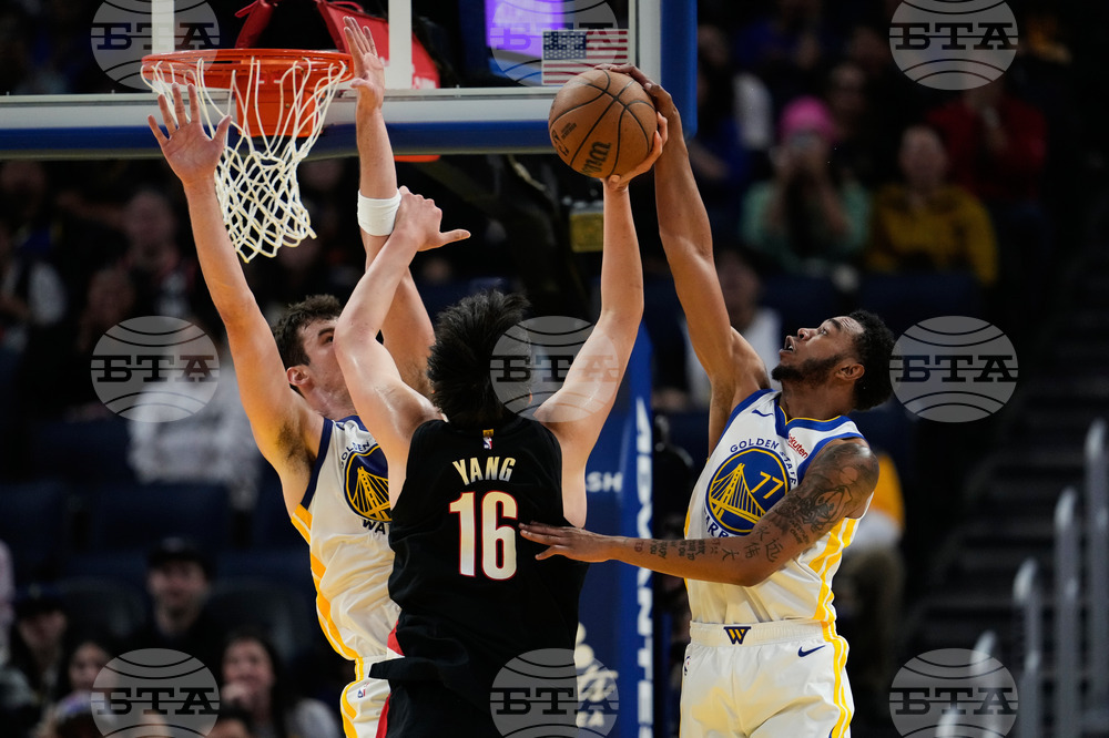 Golden State Warriors forward Jackson Rowe, second from right, shoots next to Portland Trail Blazers forward Kris Murray (24) during the second half of an NBA basketball preseason game, Wednesday, Oct. 8, 2025, in San Francisco. (AP Photo/Godofredo A. Vásquez)