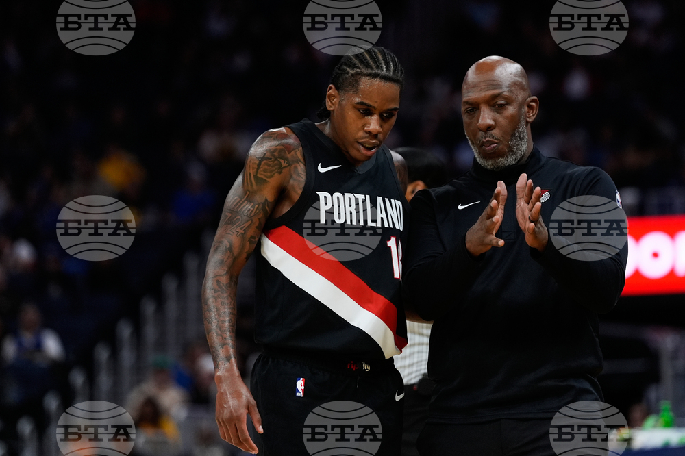Portland Trail Blazers Head Coach Chauncey Billups reacts during the first half of an NBA basketball preseason game against the Golden State Warriors, Wednesday, Oct. 8, 2025, in San Francisco. (AP Photo/Godofredo A. Vásquez)