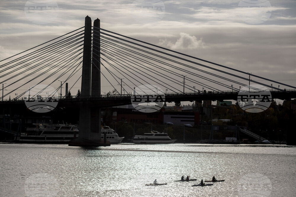 Rowers row along the Willamette River in Portland, Ore., Wednesday, Oct. 8, 2025. (Stephen Lam/San Francisco Chronicle via AP)