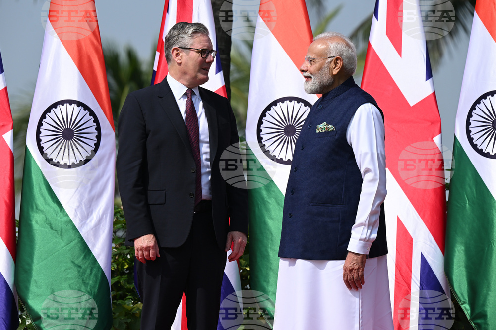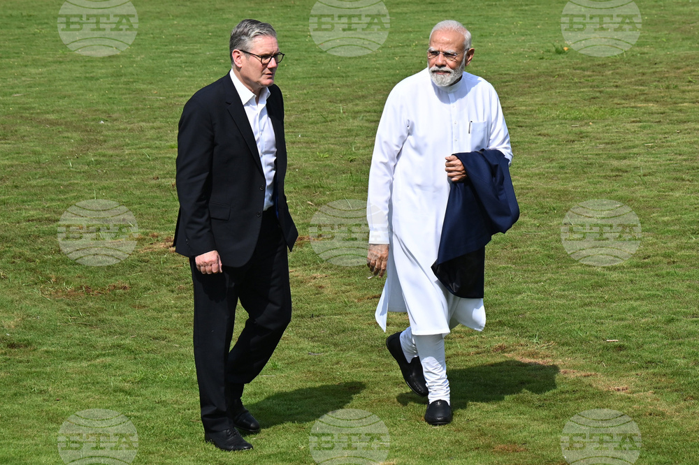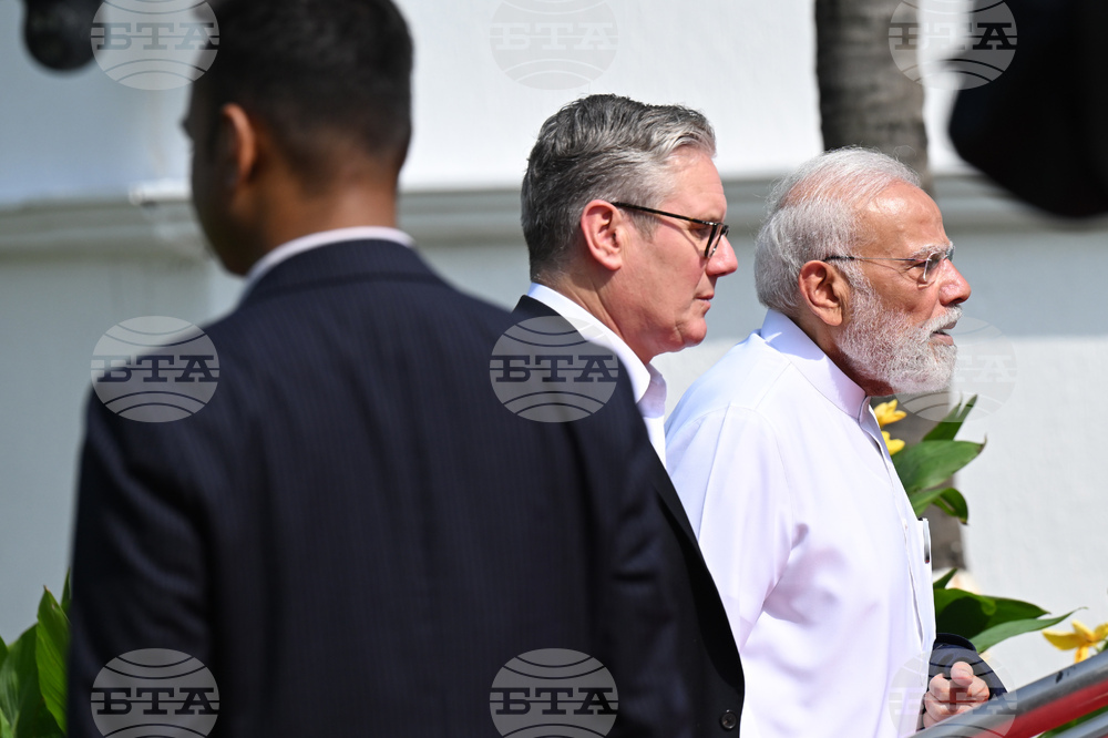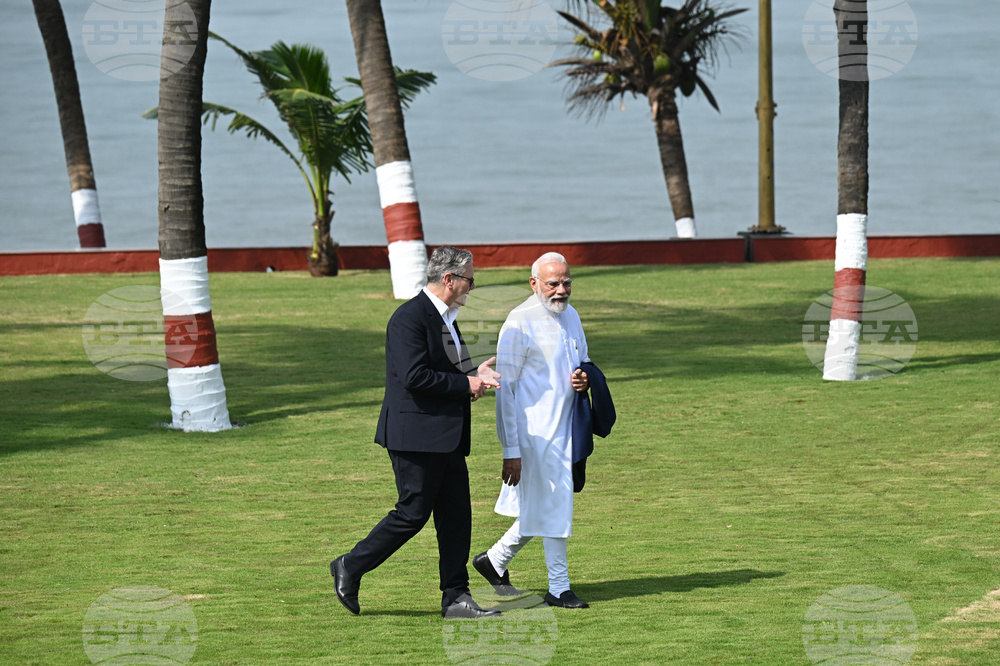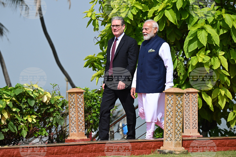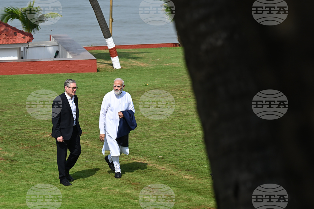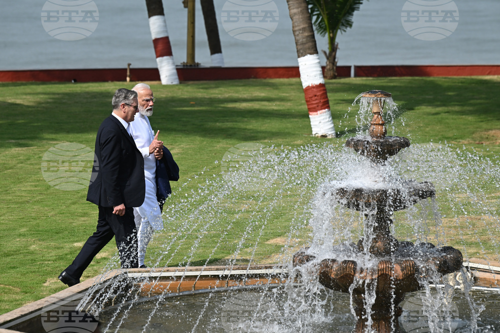 British Prime Minister Sir Keir Starmer, center and Indian Prime Minister Narendra Modi walk through the gardens at Raj Bhavan, ahead of a bilateral meeting in Mumbai, India, Thursday, Oct. 9, 2025. (Leon Neal/Pool Photo via AP)