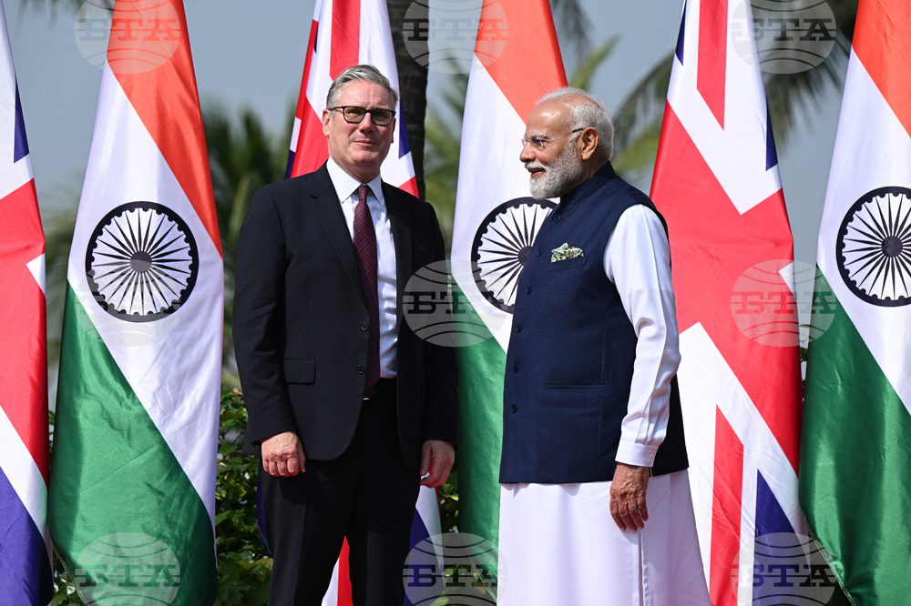 British Prime Minister Keir Starmer, left is greeted by Indian Prime Minister Narendra Modi on his arrival at Raj Bhavan in Mumbai, India, Thursday, Oct. 9, 2025. (Leon Neal/Pool Photo via AP)