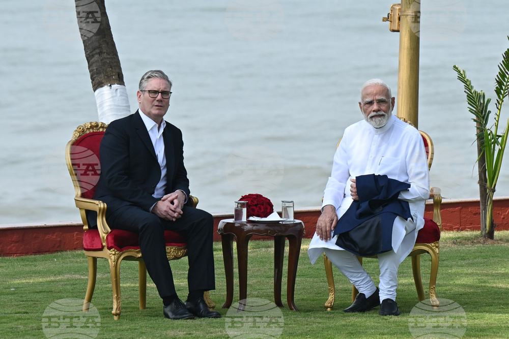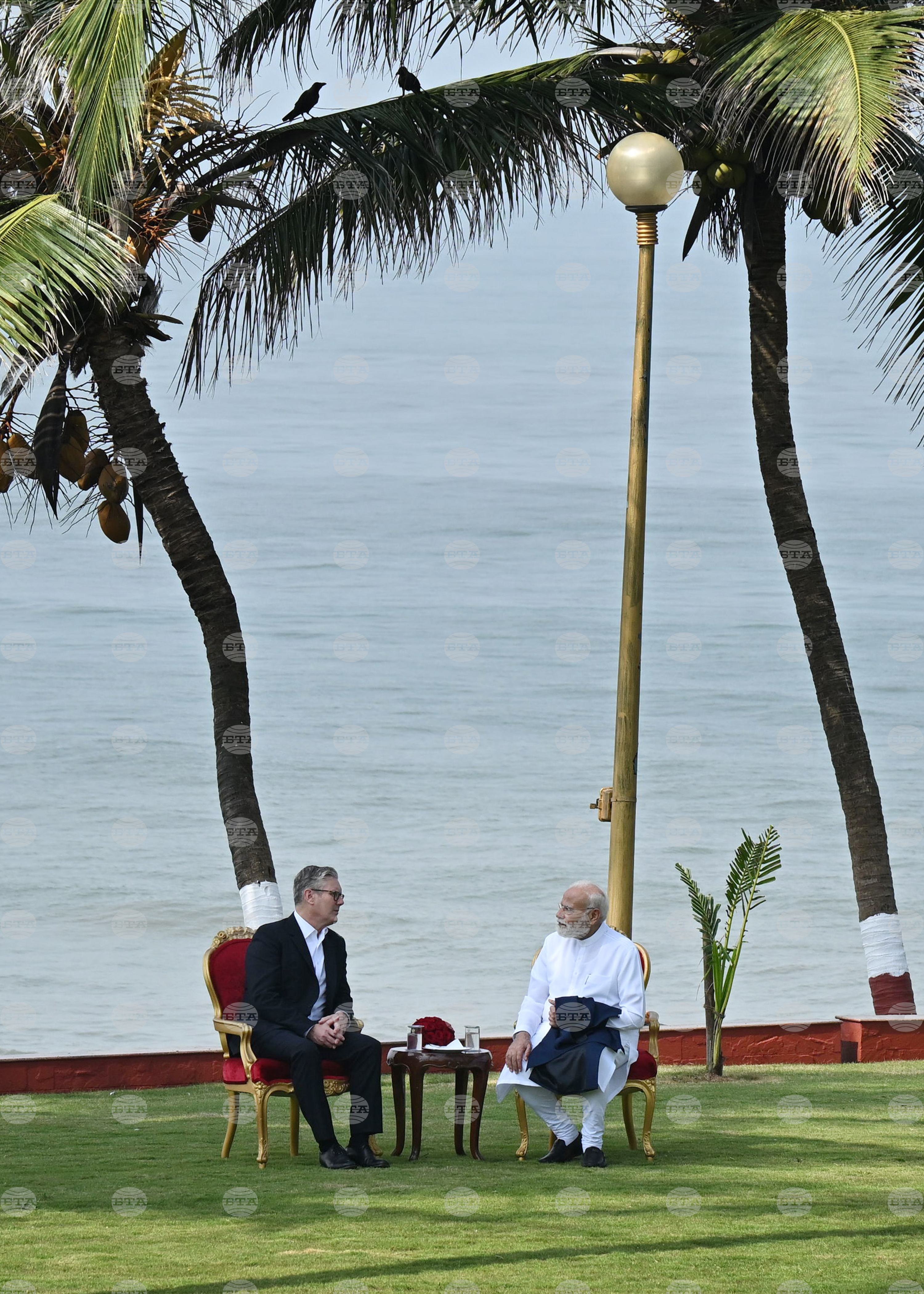 British Prime Minister Sir Keir Starmer, left and Indian Prime Minister Narendra Modi sit in the gardens at Raj Bhavan, ahead of a bilateral meeting in Mumbai, India, Thursday, Oct. 9, 2025. (Leon Neal/Pool Photo via AP)