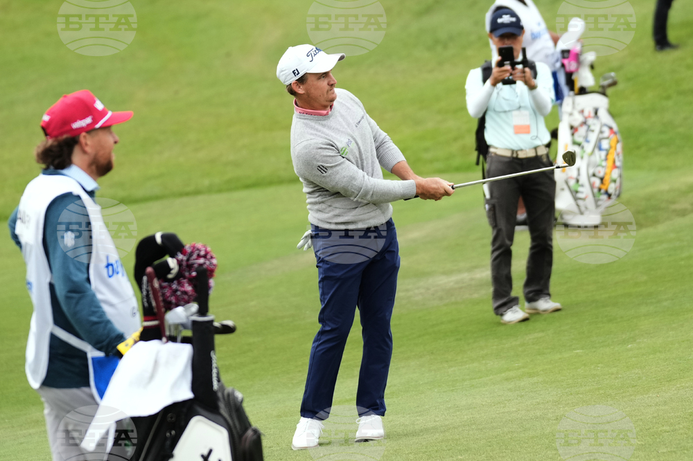 Max Greyserman of the U.S. shakes hands with his caddie after finishing the first round of the Baycurrent Classic golf tournament at the Yokohama Country Club in Yokohama, near Tokyo, Thursday, Oct. 9, 2025. (AP Photo/Hiro Komae)