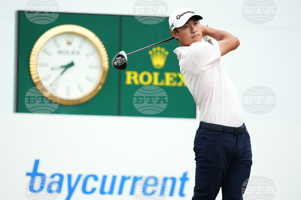Collin Morikawa of the U.S. watches his ball as he tees off on the tenth hole during the first round of the Baycurrent Classic golf tournament at the Yokohama Country Club in Yokohama, near Tokyo, Thursday, Oct. 9, 2025. (AP Photo/Hiro Komae)