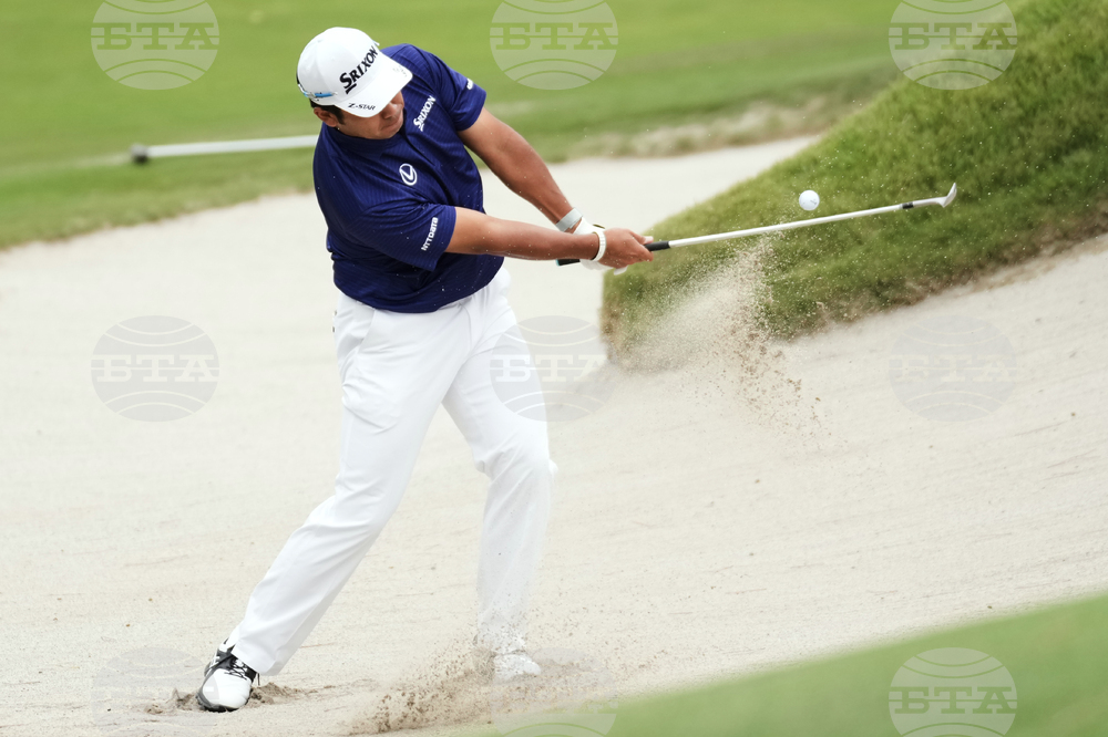 Hideki Matsuyama of Japan hits out of the bunker on the fourth hole during the first round of the Baycurrent Classic golf tournament at the Yokohama Country Club in Yokohama, near Tokyo, Thursday, Oct. 9, 2025. (AP Photo/Hiro Komae)