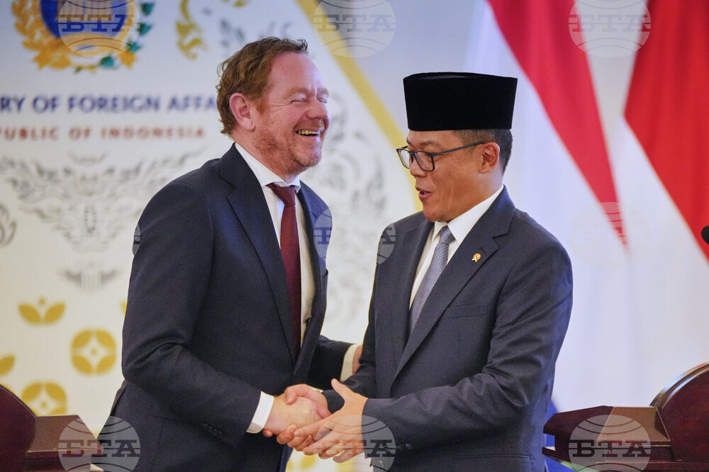 Dutch Foreign Minister David van Weel, left, shakes hands with his Indonesian counterpart Sugiono during their meeting in Jakarta, Indonesia, Thursday, Oct. 9, 2025. (AP Photo/Tatan Syuflana)