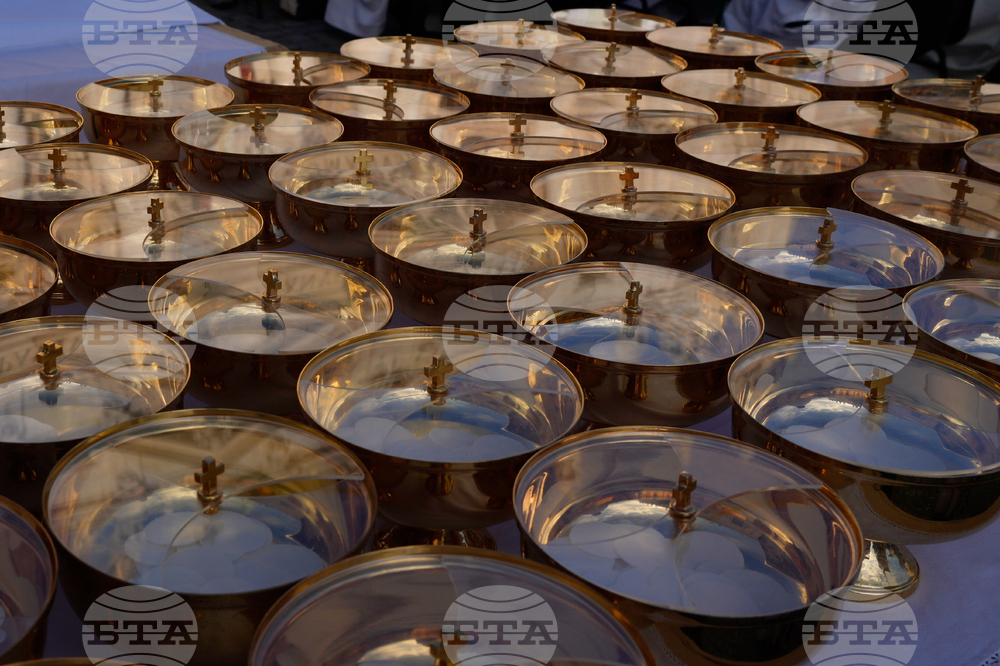 Chalices containing hosts are set on a table prior to the start of a Mass for the participants in the jubilee of ordained people with Pope Leo XIV, in St. Peter's Square, at the Vatican, Thursday, Oct. 9, 2025. (AP Photo/Gregorio Borgia)