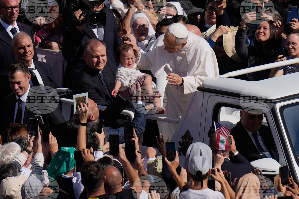 Pope Leo XIV caresses a child as he leaves after presiding over a Mass for the participants in the jubilee of ordained people in St. Peter's Square, at the Vatican, Thursday, Oct. 9, 2025. (AP Photo/Gregorio Borgia)