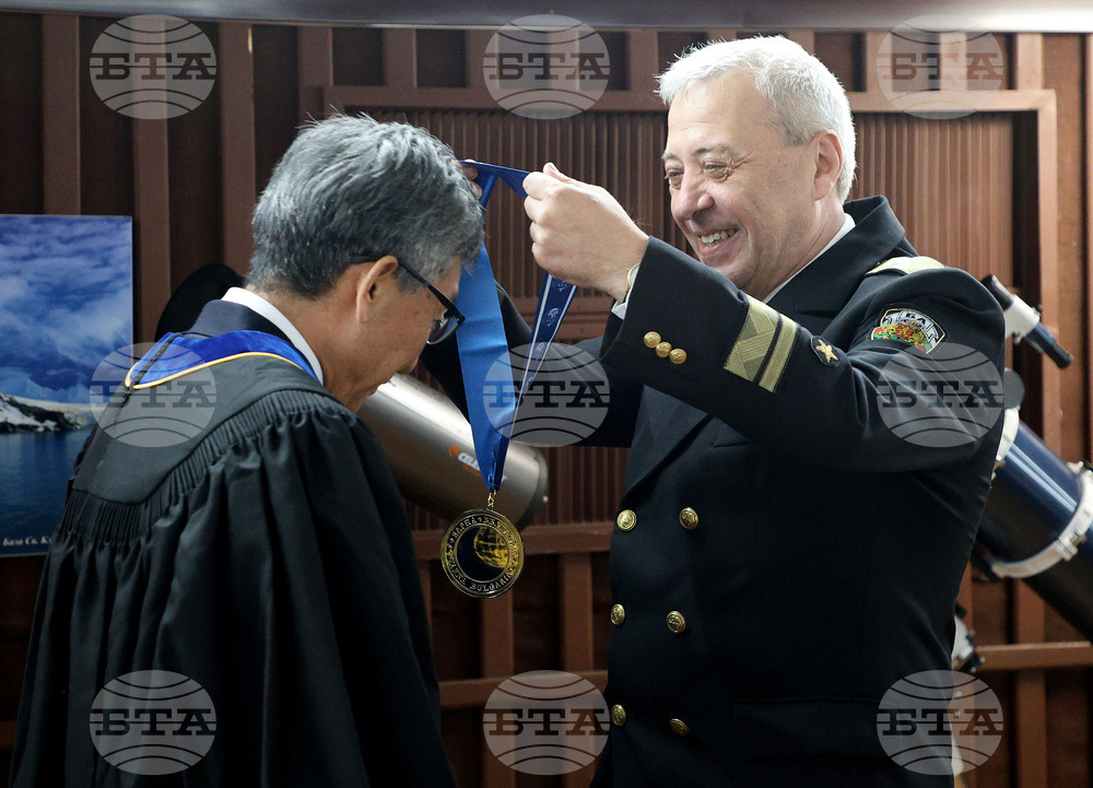 Варна (9 октомври 2025) В Звездната зала на Планетариума във ВВМУ „Н. Й. Вапцаров” се провежда церемония по удостояване с почетно научно звание „Доктор хонорис кауза” на Хирошиге Таниока (вляво), изпълнителен директор на K line. Отличието връчи началникът на училището флотилен адмирал проф. Калин Калинов (вдясно). По-късно Хирошиге Таниока посади възпоменателно дърво и участва в откриването на нов кабинет в учебното заведение.