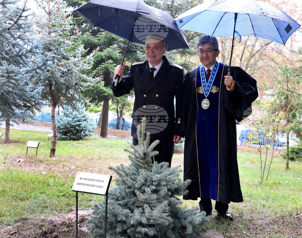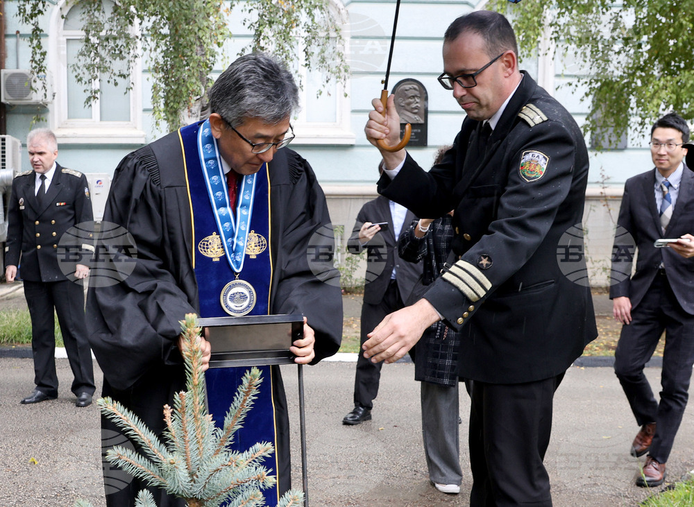 Варна (9 октомври 2025) В Звездната зала на Планетариума във ВВМУ „Н. Й. Вапцаров” се провежда церемония по удостояване с почетно научно звание „Доктор хонорис кауза” на Хирошиге Таниока (вдясно), изпълнителен директор на K line. Отличието връчи началникът на училището флотилен адмирал проф. Калин Калинов. По-късно Хирошиге Таниока посади възпоменателно дърво и участва в откриването на нов кабинет в учебното заведение.