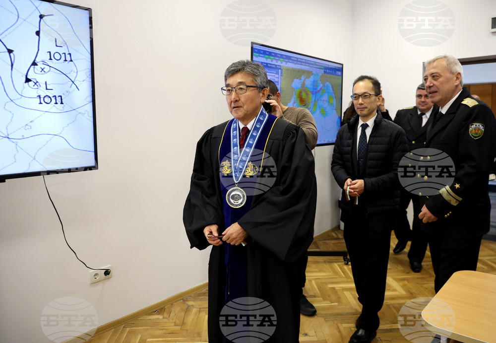 Варна (9 октомври 2025) В Звездната зала на Планетариума във ВВМУ „Н. Й. Вапцаров” се провежда церемония по удостояване с почетно научно звание „Доктор хонорис кауза” на Хирошиге Таниока (вляво), изпълнителен директор на K line. Отличието връчи началникът на училището флотилен адмирал проф. Калин Калинов. По-късно Хирошиге Таниока посади възпоменателно дърво и участва в откриването на нов кабинет в учебното заведение.