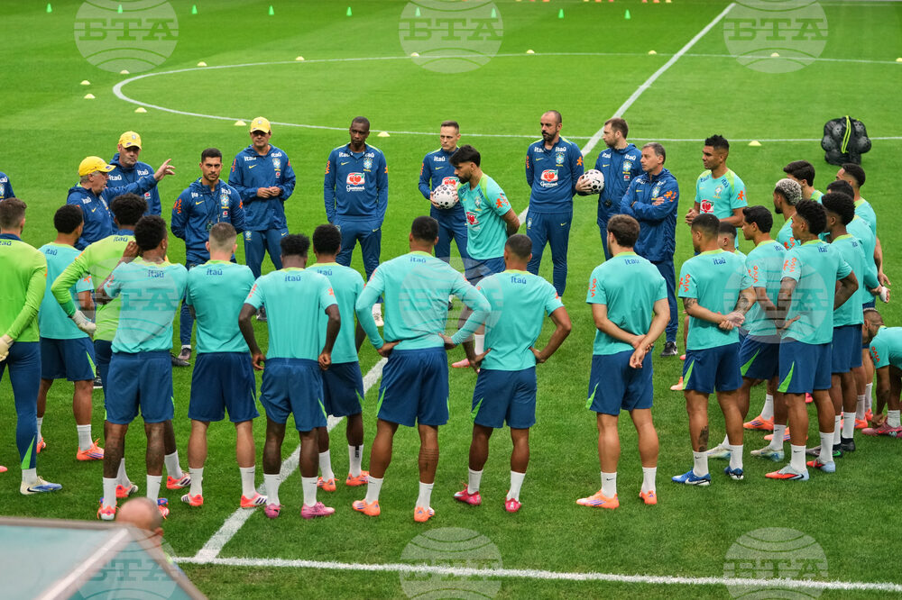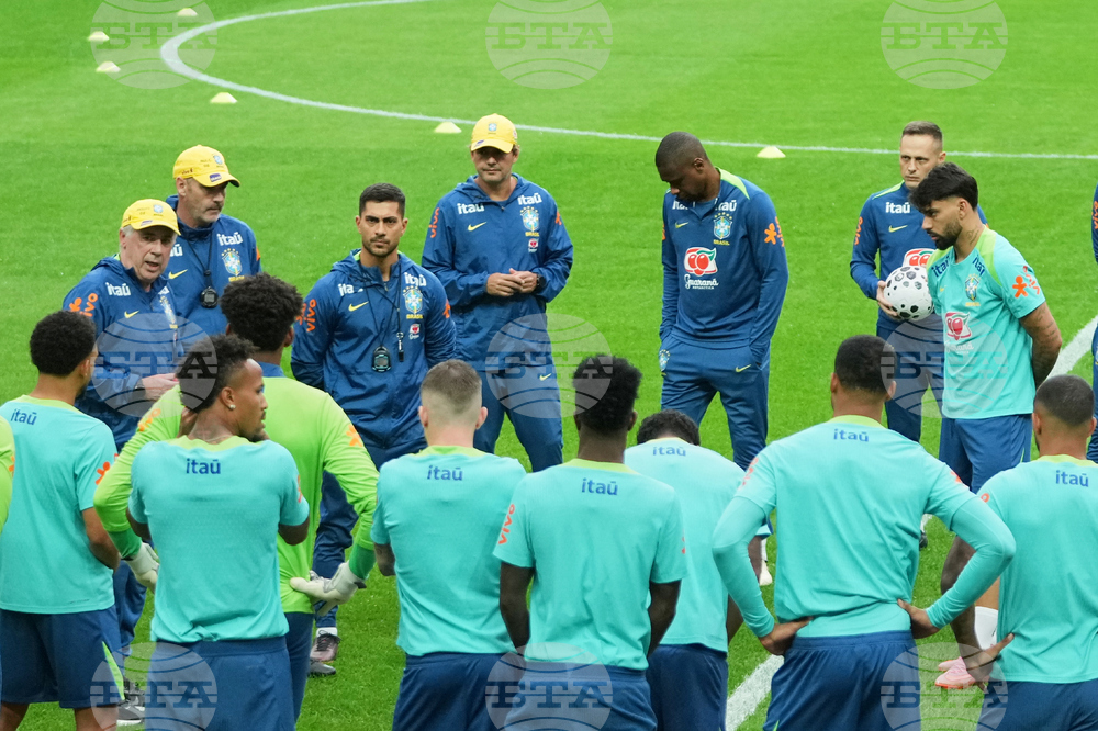 Brazil's coach Carlo Ancelotti, second from left, looks at his players during a training session ahead of a friendly soccer match against South Korea at Seoul World Cup Stadium in Seoul, South Korea, Thursday, Oct. 9, 2025. (AP Photo/Lee Jin-man)